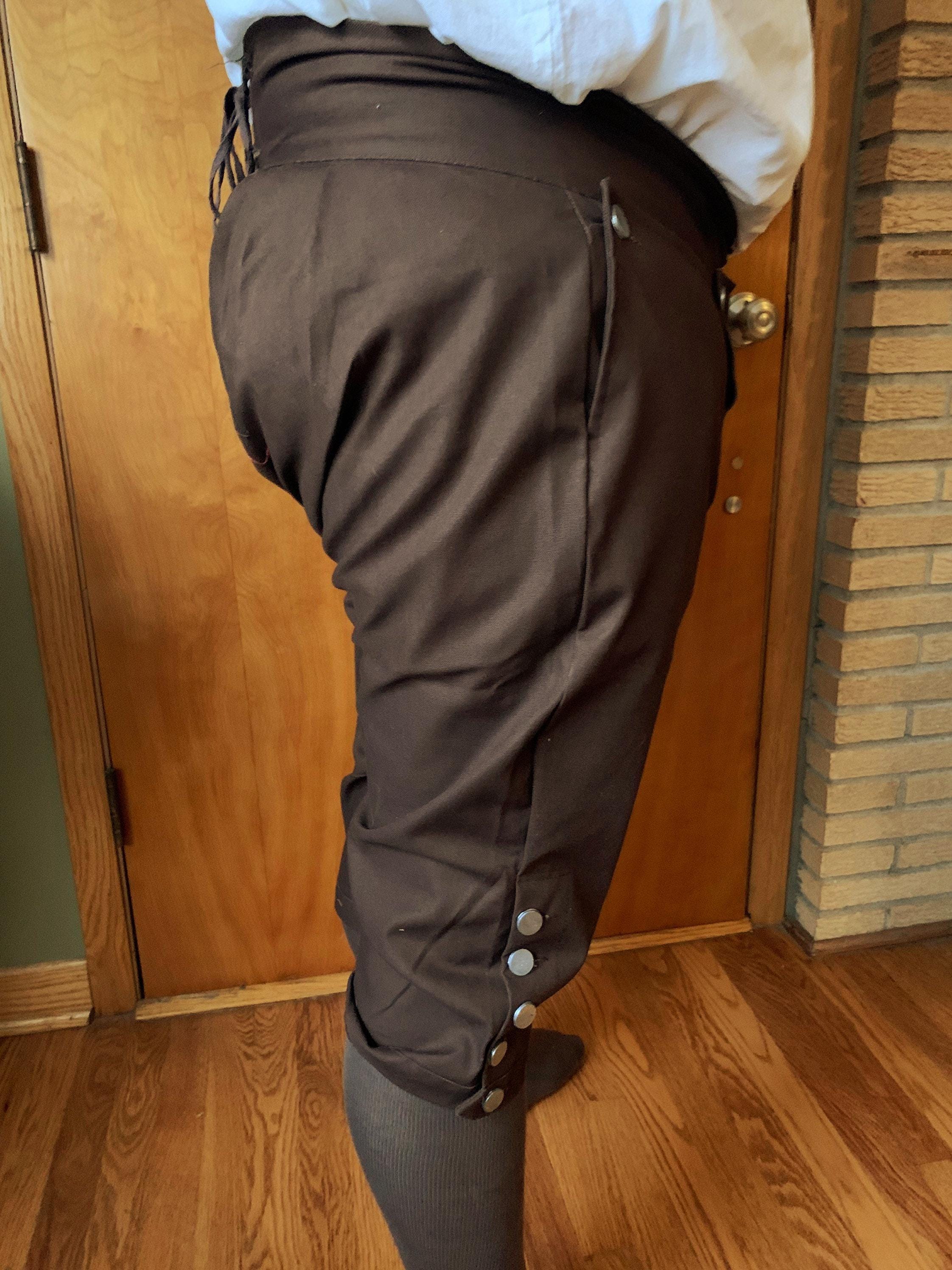 Great quality 18th and early 19th Century Men's Colonial Breeches - BROWN With deep pockets! Perfect for living history, plays, etc. Quality medium weight canvas with pewter buttons. Durable and made to last! Measurements go by waist with gusset closed. I usually recommend measuring around your gut. Otherwise they will not fit correctly. I sell suspenders/braces also.
