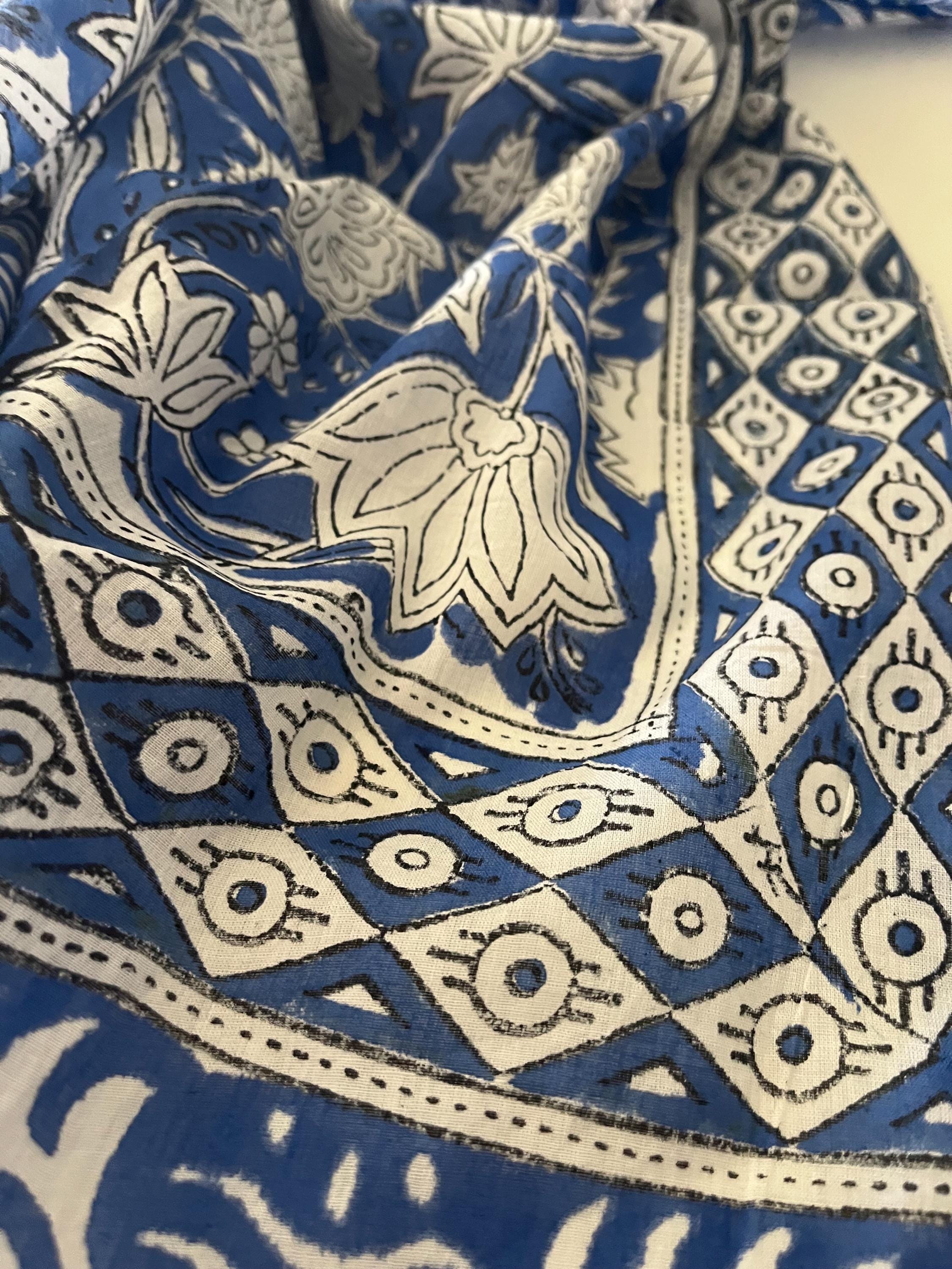 Block print handmade in India. 42 x 42 inches square. Hand blocked and colored on fine cotton with finished edges. These are great for any persona. Use them as a head wrap, neck scarf, neck tie, etc. see pictures for more color options. These are designed by The Marquette Trading Company (me)
